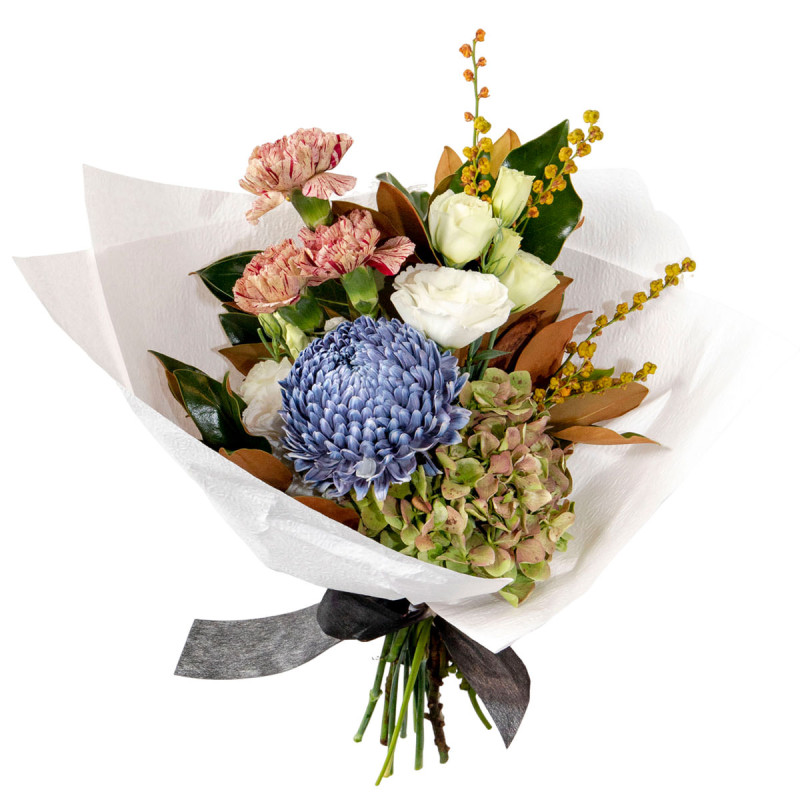 Этот букет излучает гармонию голубых и зеленых оттенков. В его составе гортензия зеленая, астра голубая, гвоздика паолетто и эустома белая, украшенные декоративной зеленью. Композиция завернута в белую бумагу с черной лентой, придающей элегантность. Создает атмосферу нежности и подойдет для благодарности коллеге.