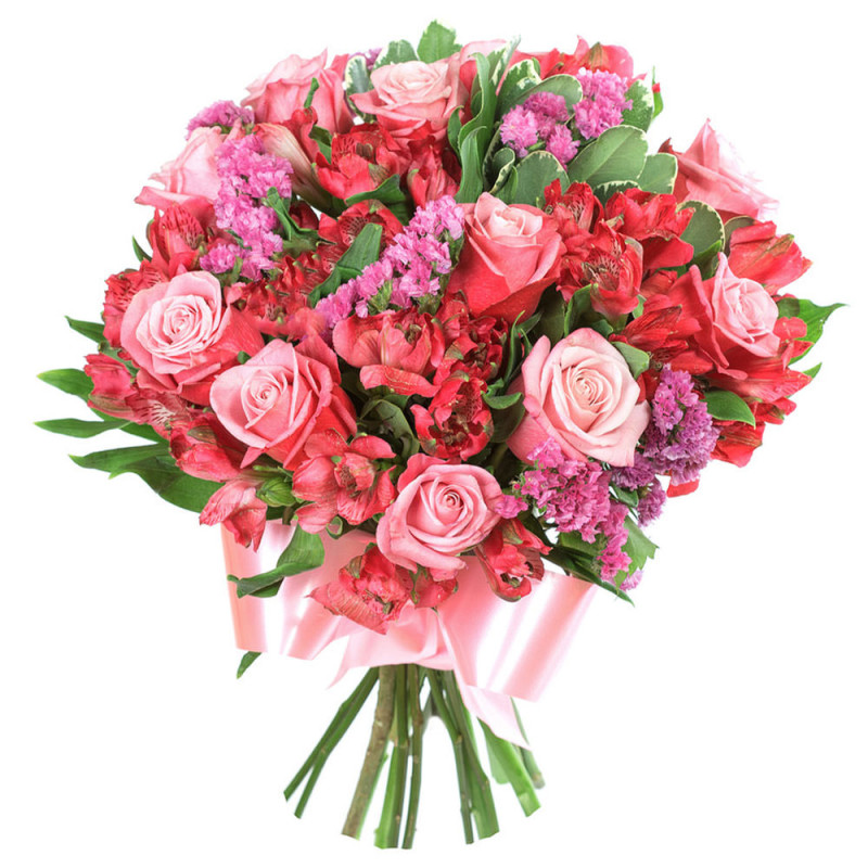 Яркие розовые розы, красные альстромерии и нежная сиреневая статица создают атмосферу радости и тепла. Букет дополнен свежей зеленью, подчеркивающей натуральную красоту цветов. Перевязан изящной розовой атласной лентой. Букет подарит праздничное настроение на юбилей для дорогой сестры.