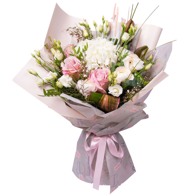 Нежные розовые и белые оттенки создают атмосферу романтики и свежести. Букет состоит из розы одноголовой розовой, белой гортензии, белого ранункулюса, белой эустомы, хамелацио, зелени и экзотики. Упакован в матовую пленку с розовой атласной лентой, которая добавляет изысканности. Эта композиция идеально подойдет для поздравления учителя с профессиональным праздником.