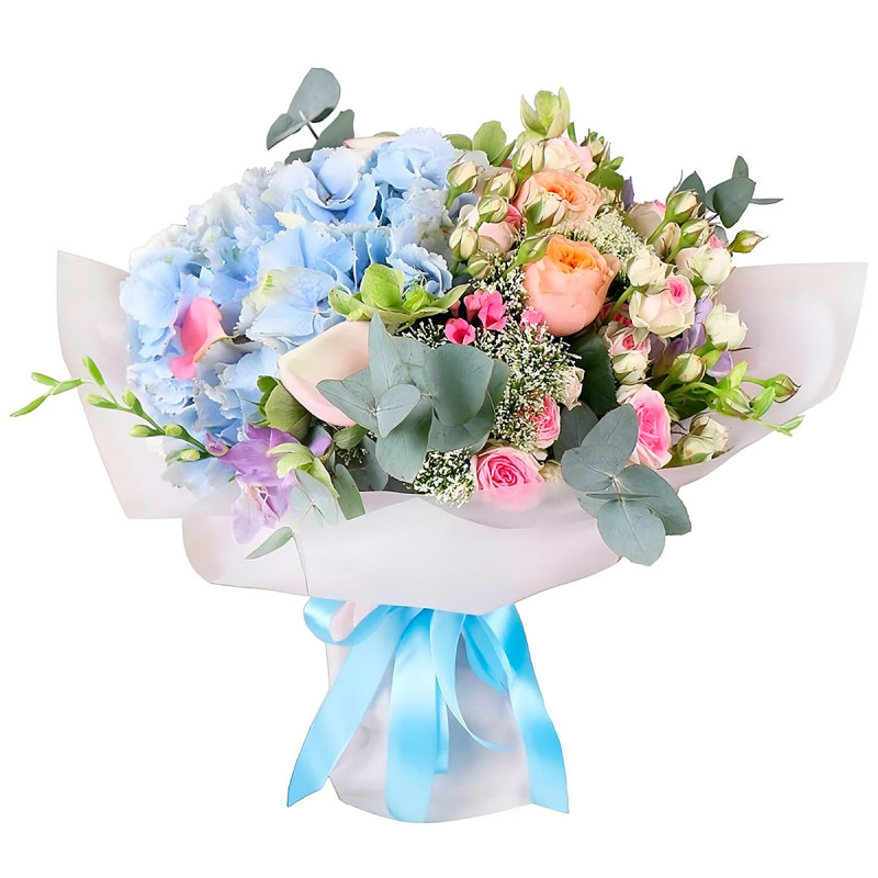 Очарование нежных оттенков голубого, персикового и розового создаёт атмосферу гармонии. В этом букете гортензия голубая, роза пионовидная персиковая, калла нежно-розовая, роза кустовая розовая и эвкалипт. Упакован в матовую плёнку с атласной лентой небесного цвета. Подходит на День матери для любимой женщины, создавая атмосферу нежности и заботы.