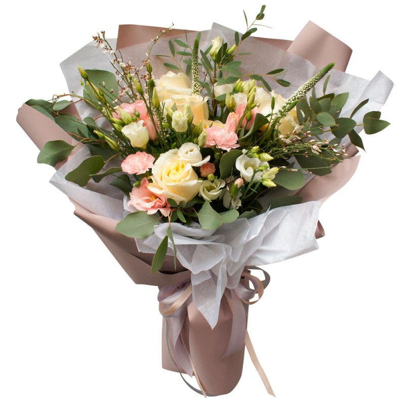 Эта композиция поражает своими мягкими пастельными оттенками, создавая атмосферу нежности и романтики. В составе букета: кремовые одноголовые розы, розовые эустомы, мини-хризантемы, вероника и эвкалипт. Упакован в матовую пленку с добавлением элегантной крафт-бумаги, украшен изящной лентой. Этот букет идеально подойдет для поздравления любимой женщины на День матери, создавая атмосферу нежности и заботы.