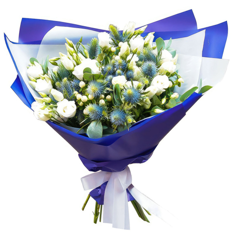 Этот букет дарит ощущение свежести и гармонии благодаря сочетанию белоснежной эустомы и гиперикума, дополненных голубыми акцентами эрингиума. Упакован в матовую пленку насыщенного синего цвета, которая придает композиции стиль и элегантность. Создаёт атмосферу зимнего волшебства и идеально подходит для благодарности коллеге. Порадует как замечательный подарок для коллеги на Новый год.