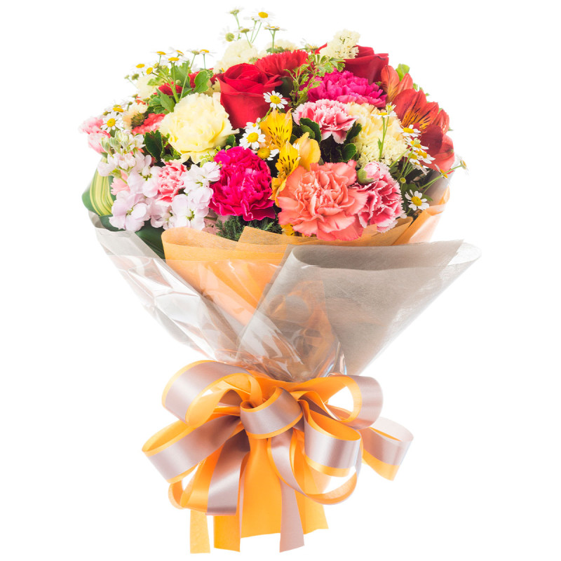 | Состав | Маттиола, Розы, Гвоздики, Альстромерии, Матрикарии, Ромашки |