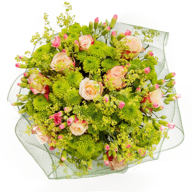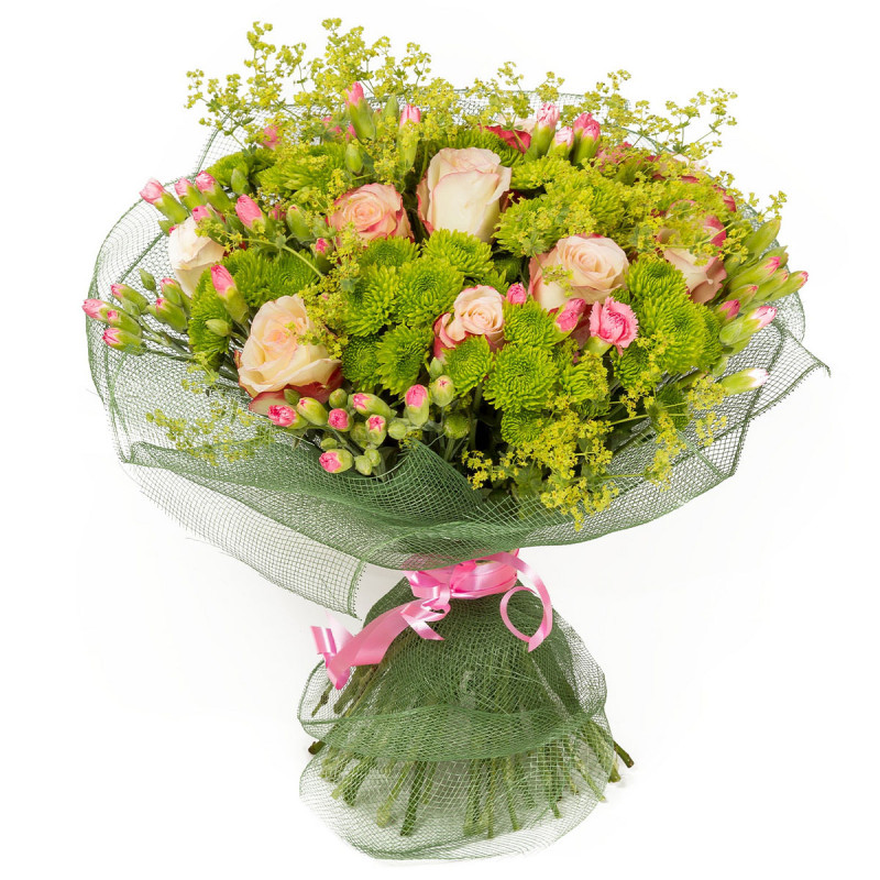 Этот букет в нежной пастельной гамме сочетает кремовые розы, зеленые кустовые хризантемы и розовые кустовые гвоздики, дополненные зеленью. Упакован в декоративную сетку зеленого цвета и украшен розовой атласной лентой. Композиция создает атмосферу свежести и легкости. Отлично подойдет для романтического вечера для любимой женщины.