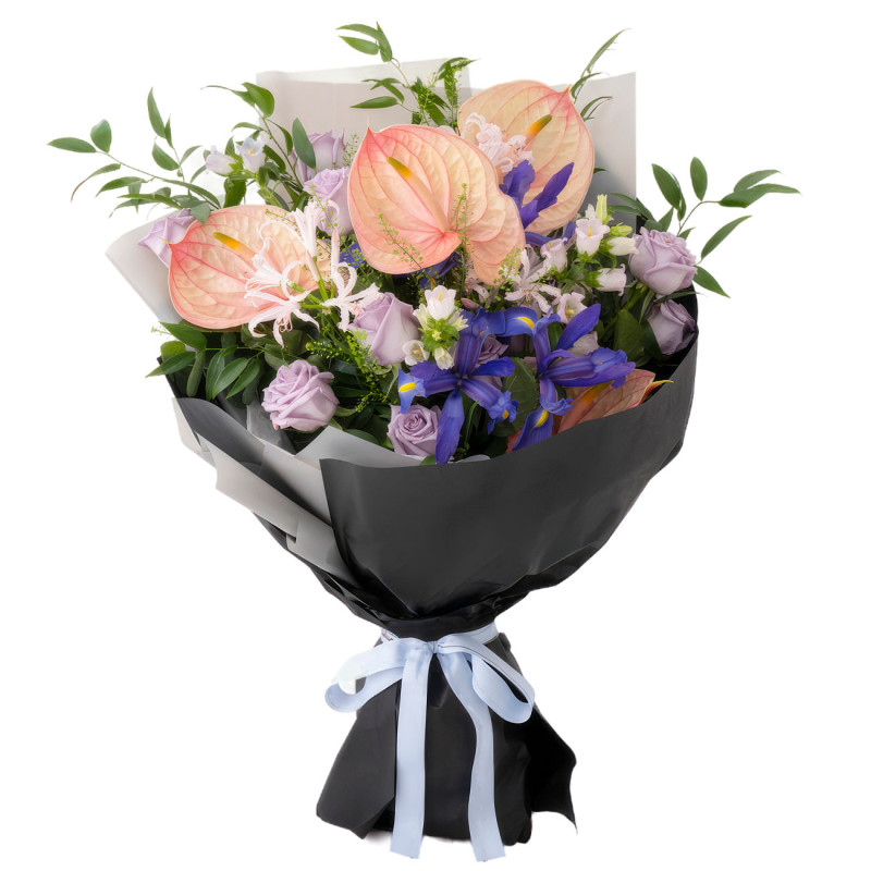 Элегантная композиция удивляет сочетанием розового антуриума, бледно-фиолетовых кустовых роз, глубоких фиолетовых ирисов и нежных белых колокольчиков, дополненных зеленью. Букет оформлен в стильную матовую пленку с чёрными и белыми акцентами, перевязанную голубой атласной лентой. Он создаёт атмосферу утончённой элегантности и станет идеальным подарком для молодой мамы на День энергетика.