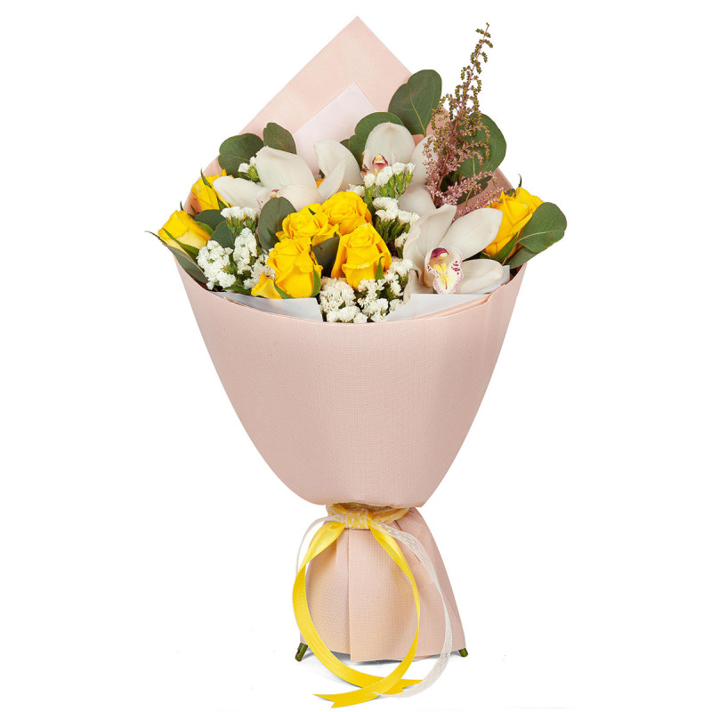 Яркое сочетание белых орхидей и жёлтых кустовых роз привносит радость и свежесть. В букете также присутствуют белая статица и зелёный эвкалипт. Букет оформлен в нежную розовую матовую плёнку и перевязан жёлтой атласной лентой. Создаёт атмосферу лёгкости и радости, идеально для дарения на платиновую свадьбу для свекрови.