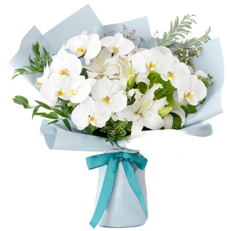 Элегантное сочетание белоснежных орхидей и лилий придаёт букету изысканность и чистоту. В составе орхидея белая ‘Бабочка’, лилия белая, ваксфлауэр и зелень. Упакован в нежную голубую матовую плёнку с атласной лентой бирюзового цвета. Букет создаёт атмосферу утончённой нежности и станет прекрасным подарком для подруги на День влюблённых.