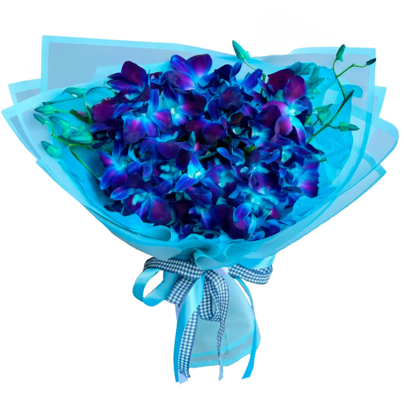 Восхитительный синий оттенок дендробиумов мгновенно привлекает внимание. Букет состоит исключительно из синих дендробиумов, что делает его уникальным и изысканным. Упакован в матовую плёнку с атласной лентой небесного цвета, что придаёт композиции особую элегантность. Эта композиция создаёт атмосферу загадочности и утончённости. Идеально подойдёт для встречи из поездки, чтобы порадовать любимую женщину.