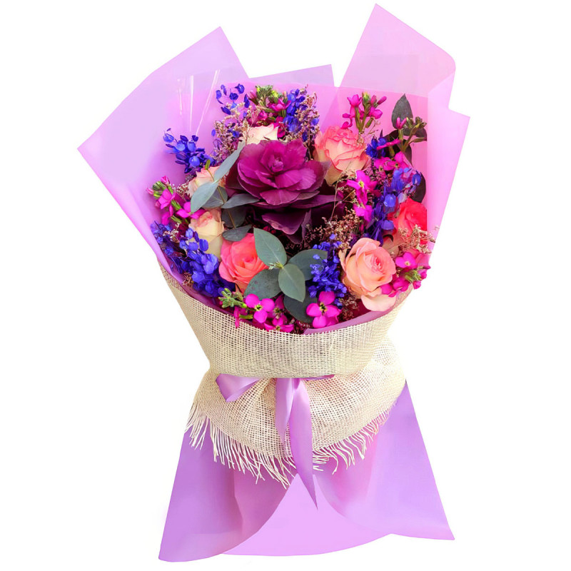 Этот букет завораживает своей яркой фиолетово-розовой гаммой. В его составе брассика, розовая одноголовая роза, сиреневая маттиола и синяя лунария. Упакован в нежную фиолетовую пленку и декоративную сетку, перевязанную атласной лентой. Такой букет создаёт атмосферу нежности и романтики, идеально подойдёт для встречи из поездки для любимого человека.