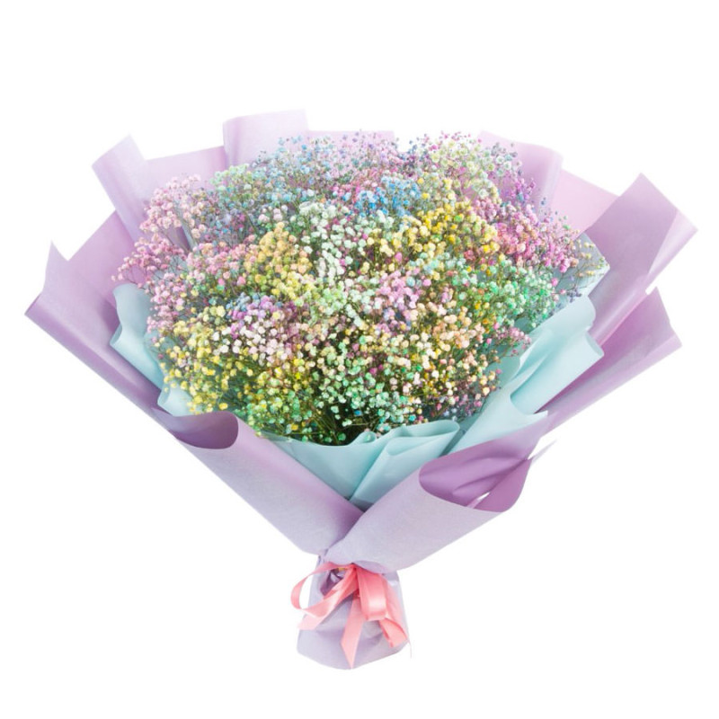 Этот букет из розовой, белой, голубой, жёлтой и зелёной гипсофилы создаёт радужное настроение. Цветы аккуратно завернуты в матовую плёнку нежного лавандового оттенка и перевязаны розовой атласной лентой. Композиция дарит атмосферу лёгкости и радости, подходящую для новоселья. Идеальный подарок для подруги, чтобы отметить важное событие.