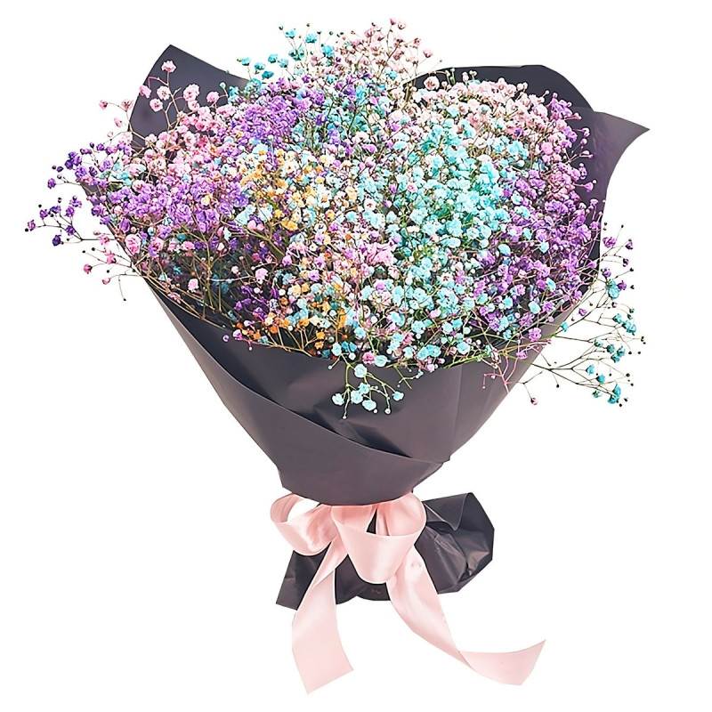Яркие оттенки белого, желтого, розового, сиреневого и голубого гипсофила дарят радость и легкость. Букет состоит из белой, желтой, розовой, сиреневой и голубой гипсофилы. Упакован в черную матовую пленку с розовой атласной лентой. Создает атмосферу нежности и изысканности. Подойдет для поздравления учительницы на День знаний.
