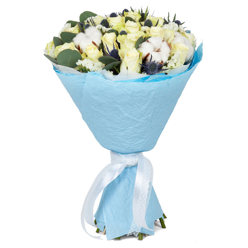 Изящное сочетание кремовых роз и белого хлопка создаёт атмосферу нежности и утончённости. В букете также присутствуют эрингиум, статица белая и эвкалипт, которые добавляют глубину и текстуру. Композиция обернута в голубую бумагу и перевязана белой лентой, что подчёркивает её изысканность. Идеально подойдёт для поздравления коллеги с повышением, создавая атмосферу торжества и радости.