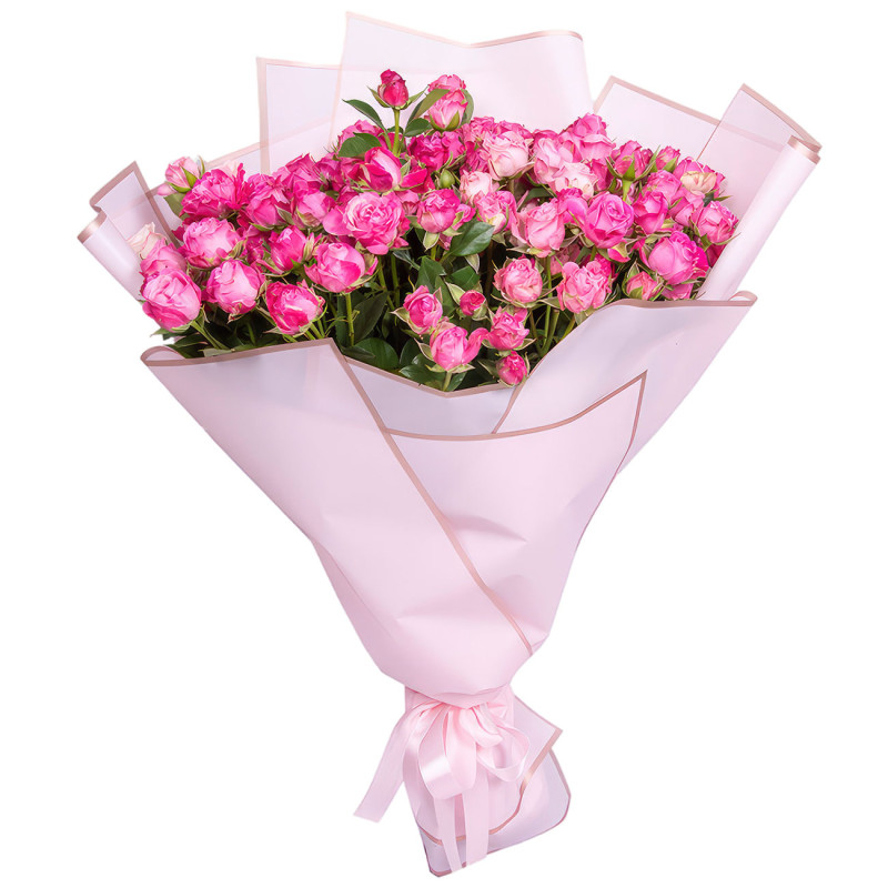 Яркий розовый цвет кустовых роз «Бомбастик» вызывает чувство нежности и радости. Букет оформлен в матовую плёнку светло-розового оттенка, аккуратно перевязанную розовой атласной лентой. Композиция создаёт атмосферу романтической утончённости. Подойдёт для поздравления сестры на день рождения.