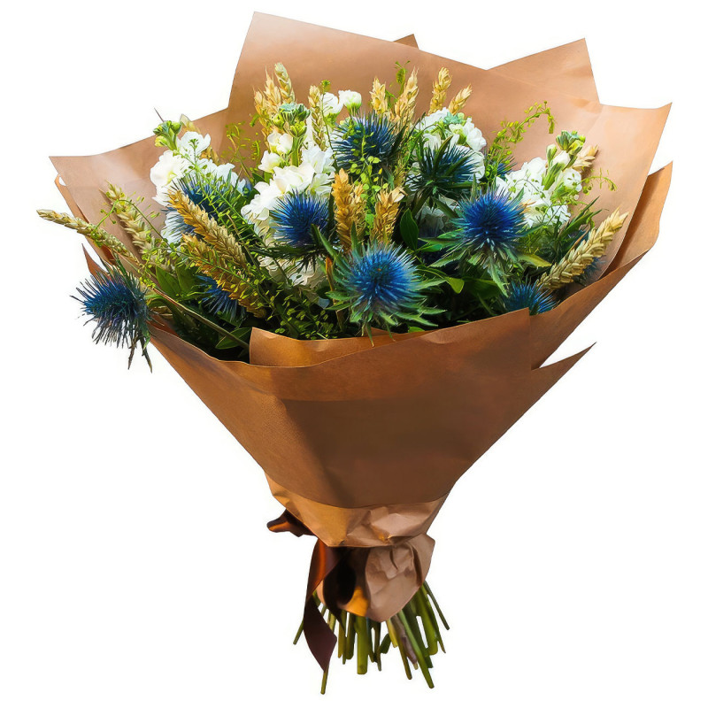 Этот букет радует глаз сочетанием белой маттиолы, синих эрингиумов и золотистых колосьев пшеницы. Все цветы аккуратно собраны и обернуты в крафт-бумагу, которая придаёт композиции теплый и естественный вид. Букет можно упаковать в матовую пленку для более современного стиля. Эта композиция создаёт атмосферу умиротворения и радости. Идеальный подарок для жены на День строителя.