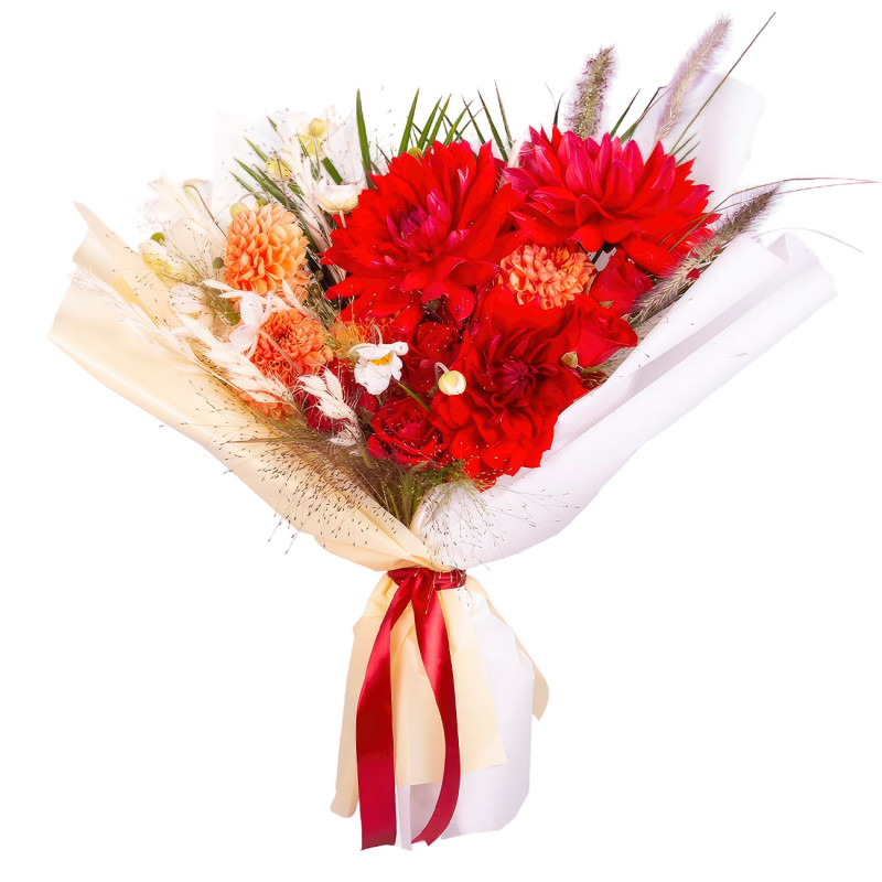 Яркие красные и оранжевые оттенки создают атмосферу радости и энергии. В составе букетов — красные и оранжевые георгины, красные одноголовые розы, экзотические и полевые цветы. Упакован в матовую плёнку с красной лентой, которая добавляет изысканности. Идеален для свидания и порадует вашу возлюбленную.