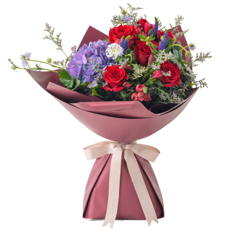 Элегантный букет в бордовых и фиолетовых тонах вызывает чувство восхищения. В его составе красные одноголовые розы, вероника, фиолетовая гортензия, красная альстромерия и каспия. Упакован в бордовую матовую плёнку и перевязан нежной атласной лентой. Эта композиция создаёт атмосферу изысканности и подойдёт для поздравления подруги на день рождения.