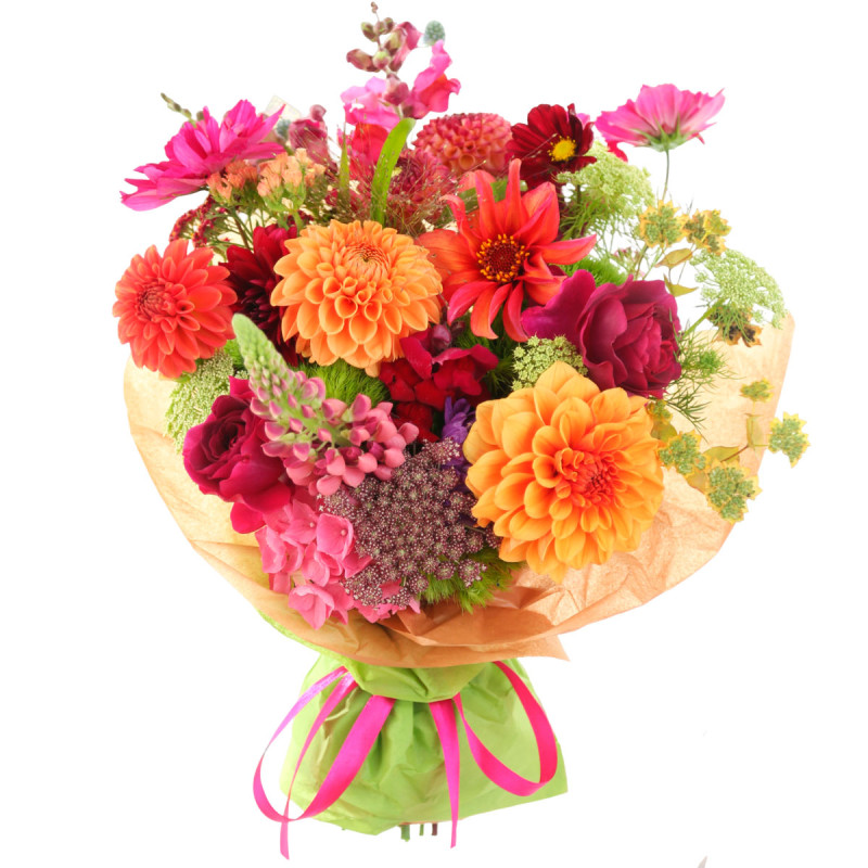 Этот яркий букет наполнен красными и оранжевыми георгинами, розовым люпином, розовой гортензией, космеей и персиковой статицей. Упакован в крафт-бумагу с матовой плёнкой и дополнен яркой лентой. Композиция создаёт атмосферу радости и вдохновения. Подойдёт для поздравления преподавателя на профессиональный праздник.