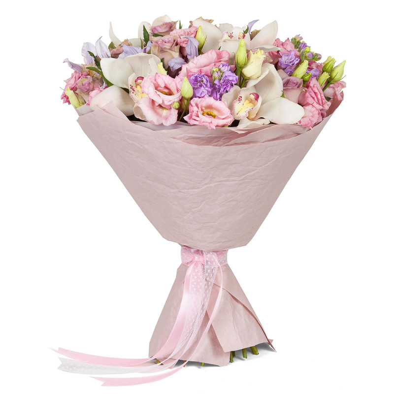 Этот букет изящно сочетает в себе нежные оттенки белой орхидеи, розовой эустомы и сиреневой маттиолы. Цветы аккуратно завернуты в розовую бумагу, связаны розовой атласной лентой, создавая утончённый и романтичный образ. Композиция подарит атмосферу нежности и уюта. Идеально подойдет для поздравления мамы на День матери.