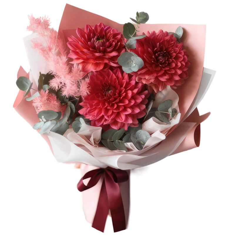 В этом букете доминируют насыщенные красные георгины, которые гармонично сочетаются с нежной зеленью эвкалипта. Упакован в стильную матовую плёнку и украшен изысканной тёмно-красной лентой. Композиция создаёт атмосферу романтики и утончённости. Идеально подойдёт для свидания с любимой женщиной.
