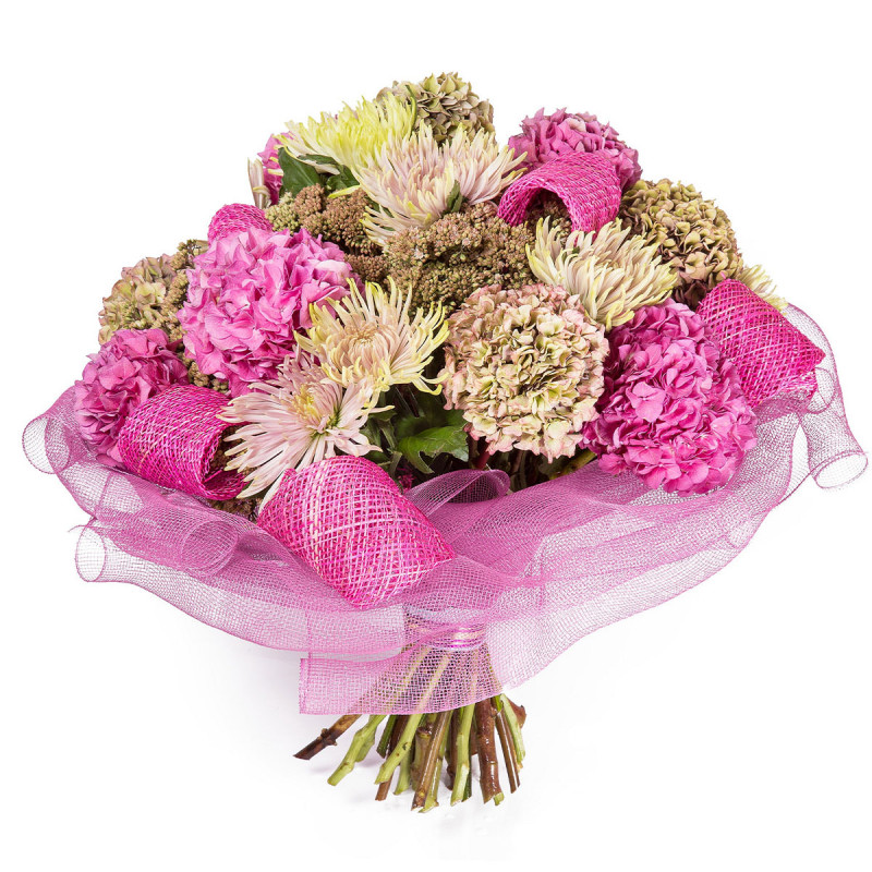 Этот букет наполняет атмосферу нежностью и романтикой благодаря розовым и кремовым гортензиям, изящным хризантемам ‘Улыбка’ и озотамнусу. Цветы искусно оформлены в яркую розовую сетку, которая добавляет композиции игривости. Такой букет подойдёт для декора мероприятия, создавая атмосферу элегантности и утончённости. Отличный подарок для молодой мамы на встречу из роддома.