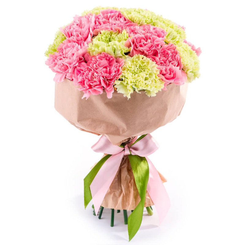 Яркие розовые и нежные зелёные оттенки гвоздик создают атмосферу радости и свежести. В составе букета: гвоздика микс (жёлтая, розовая). Упакован в крафт-бумагу с атласной лентой, придающей изысканность. Этот букет создаёт атмосферу весеннего обновления и идеально подойдёт для поздравления на день рождения для любимой женщины.