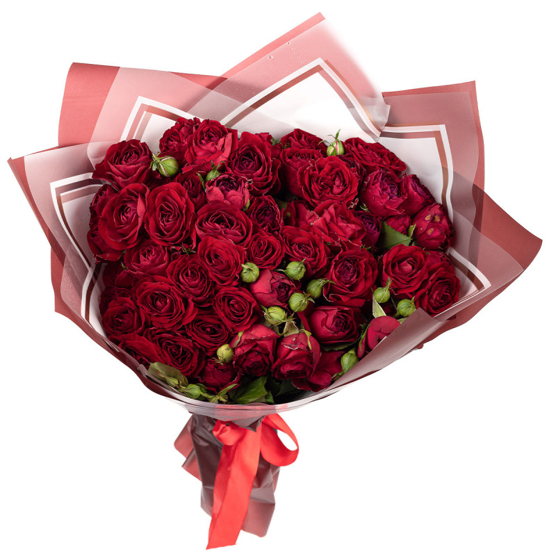 Этот букет создает атмосферу теплого и страстного настроения благодаря насыщенному красному цвету кустовых роз. Букет состоит исключительно из красных кустовых роз. Упакован в матовую пленку с красной атласной лентой, которая придает элегантность композиции. Идеально подойдет для романтического вечера для любимой женщины.
