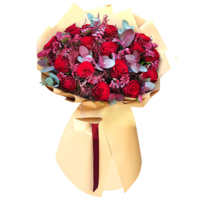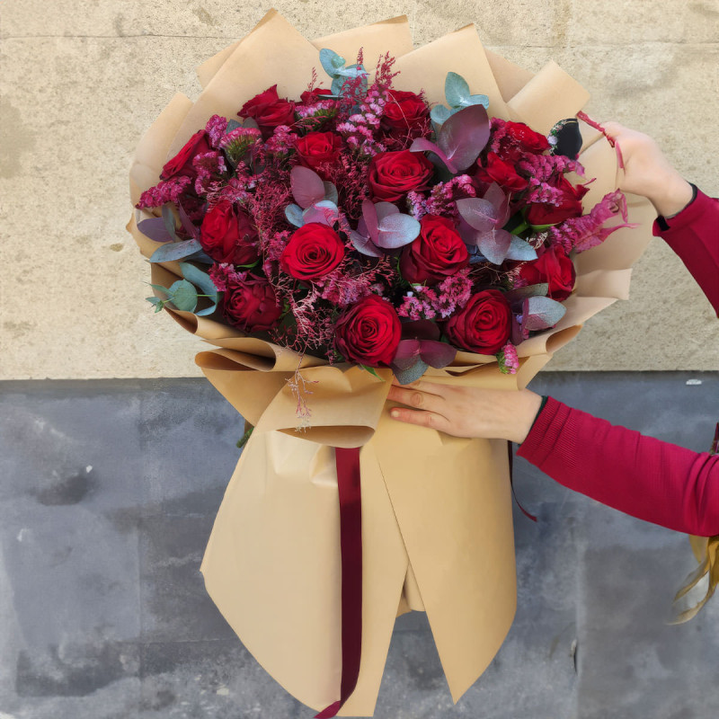 Эта композиция излучает страсть и элегантность благодаря насыщенным красным розам. В букете гармонично сочетаются роза одноголовая красная, статица розовая и эвкалипт. Упакован в кремовую крафт-бумагу с бордовой лентой, что придаёт ему изысканность. Букет создаёт атмосферу нежности и романтики, идеально подходя для свидания или подарка для любимой женщины.