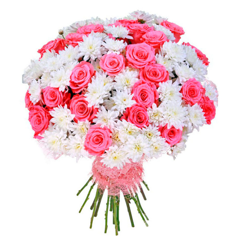 Этот букет в розово-белой цветовой гамме излучает элегантность и утонченность. В его составе розовые одноголовые розы и белые кустовые хризантемы. Упаковка из розовой сетки аккуратно перевязана декоративной лентой. Композиция создаёт атмосферу романтики и гармонии. Идеально подойдёт для подарка на День Святого Валентина для любимой женщины.
