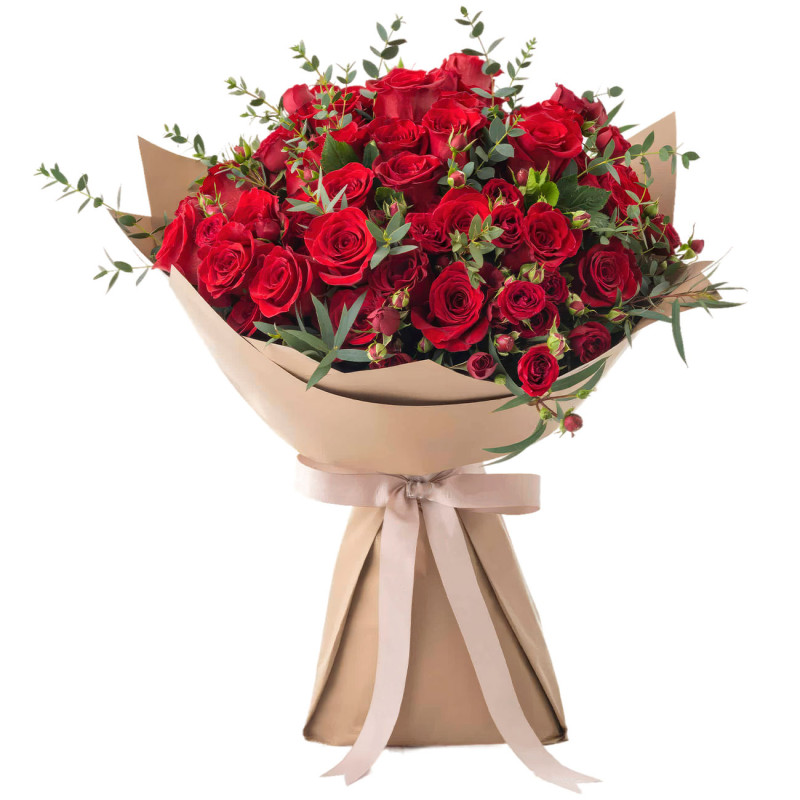 Букет в ярких красных тонах, в котором гармонично сочетаются кенийские красные розы и эвкалипт. Упакован в крафт-бумагу с аккуратной светлой лентой. Такая композиция создаёт атмосферу романтики и элегантности. Идеально подойдет для поздравления любимой женщины на юбилей.