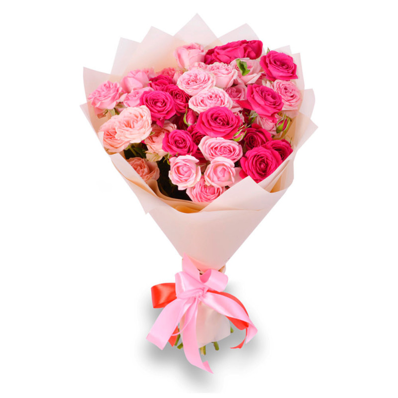 Этот букет сочетает в себе нежные оттенки розового и пышные кустовые розы. Оформлен в матовую плёнку и крафт-бумагу, дополнен яркой лентой. Композиция создаёт атмосферу нежности и романтики. Идеально подойдёт для встречи из поездки для любимой женщины.