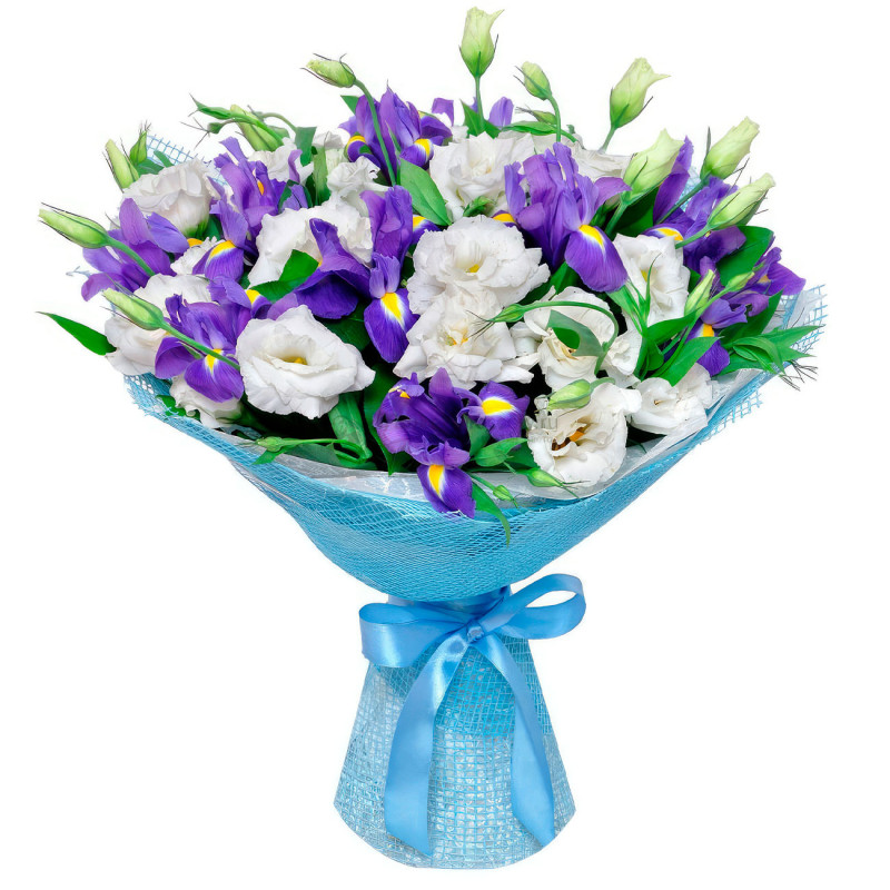 Этот букет в бело-фиолетовой гамме вызывает ощущение свежести и нежности. В составе белый лизиантус и фиолетовый ирис, дополненные зеленью. Упакован в голубую сетку, завязанную атласной лентой того же цвета. Эта композиция создаёт атмосферу лёгкости и романтики. Идеально подойдёт для поздравления медсестры на профессиональный праздник.
