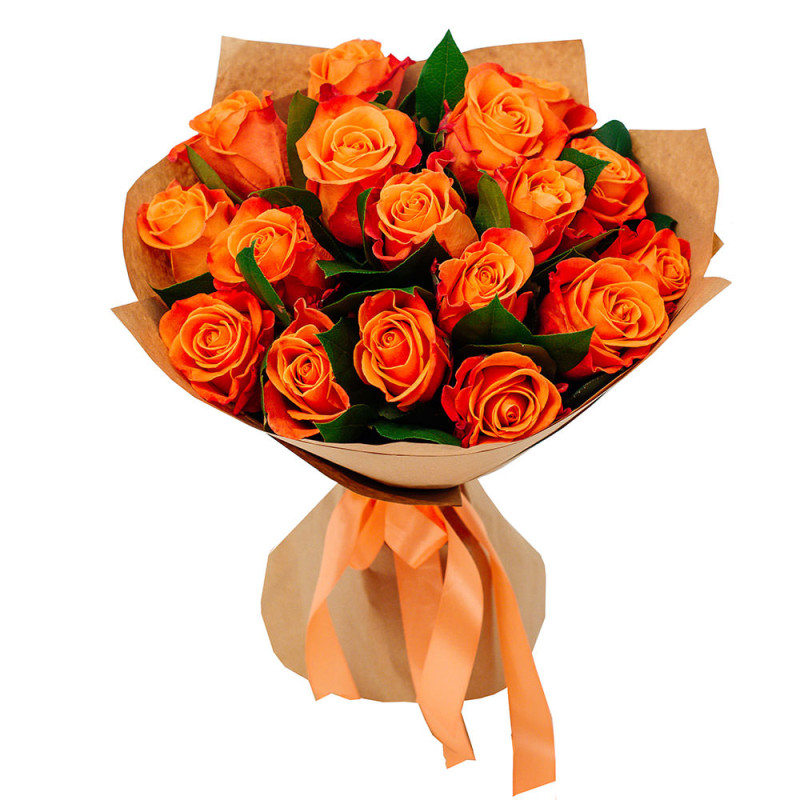 Яркая оранжевая палитра поднимает настроение. В букете собраны одноголовые оранжевые розы и зелень. Упаковка выполнена из крафт-бумаги, дополненная элегантной оранжевой лентой. Этот букет создаёт атмосферу радости и тепла. Прекрасно подойдёт для встречи из роддома для любимой жены.
