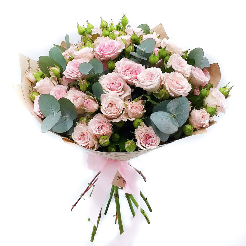 Нежные оттенки розового в этом букете создают атмосферу нежности и романтики. В композиции роза кустовая эквадор розовая и эвкалипт, которые идеально гармонируют друг с другом. Упаковка выполнена из крафт-бумаги с матовой плёнкой, украшена светлой атласной лентой. Этот букет привнесёт уют и радость в любой дом, станет прекрасным подарком для коллеги на новоселье.