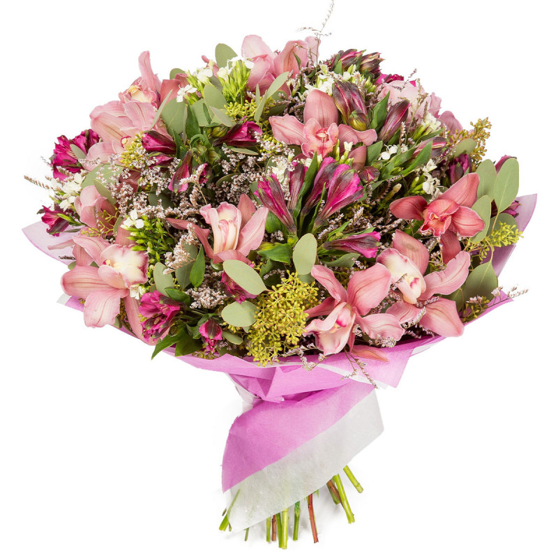 Этот букет завораживает нежными оттенками розового, создавая атмосферу легкости и романтики. В его составе розовые орхидеи, альстромерии и лимониум, обрамленные зелеными акцентами. Упакован в матовую пленку нежного розового оттенка и украшен декоративной лентой. Идеально подойдет для встречи из роддома, создавая уютное и радостное настроение для молодой мамы.
