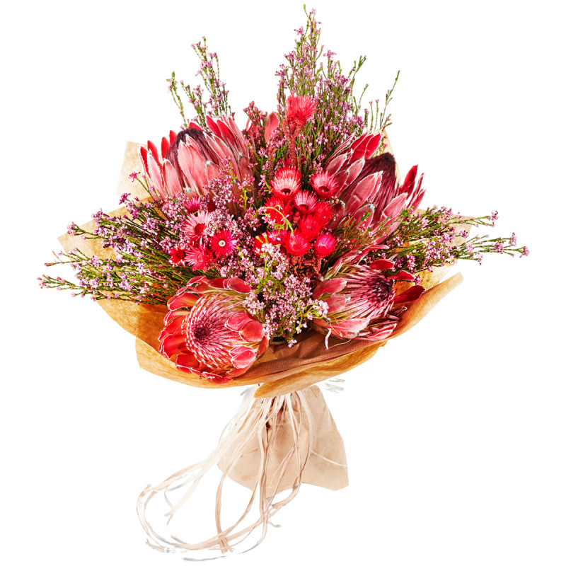Этот букет поражает яркой цветовой палитрой красных и розовых оттенков. В нем гармонично сочетаются протея, розовый вереск и мезембриантемум. Упакован в крафт-бумагу с декоративной сеткой и завязан натуральной лентой. Композиция создаёт атмосферу радости и изысканности. Подарок идеально подойдёт для любимой на День Святого Валентина.