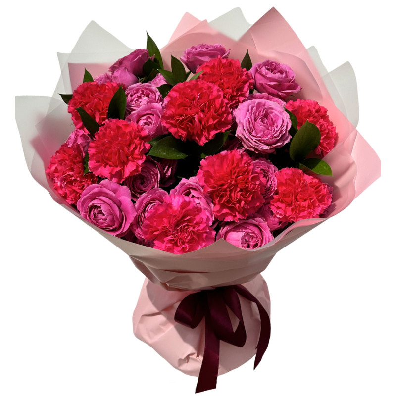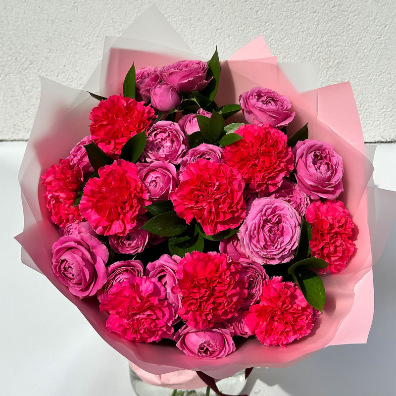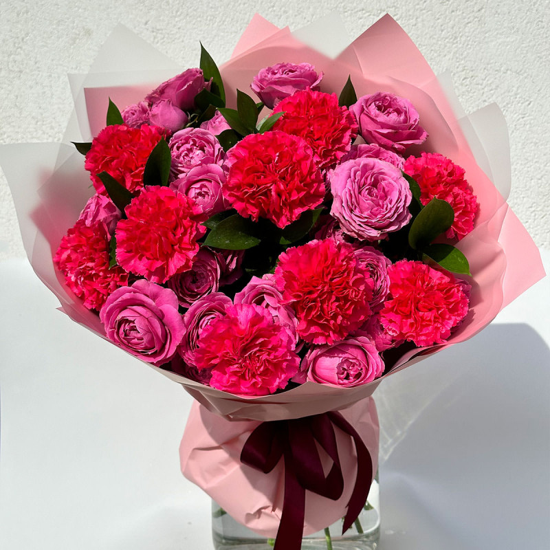 Яркое сочетание розовых роз и бордовых диантусов создает атмосферу радости и тепла. Букет оформлен в нежно-розовую матовую пленку и перевязан атласной лентой насыщенного цвета. Такая композиция привнесет уют и станет прекрасным подарком для молодой мамы на новоселье.