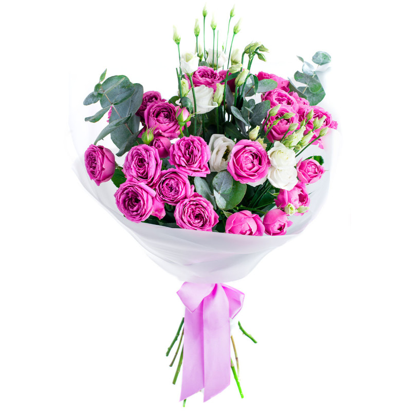 Цветовая гамма букета сочетает в себе нежные розовые и белые оттенки, создавая атмосферу лёгкости и свежести. В составе — розовая кустовая роза, белая эустома и эвкалипт. Упакован в матовую плёнку с розовой лентой, придающей композиции особый шарм. Этот букет станет идеальным подарком на День матери для любимой женщины.