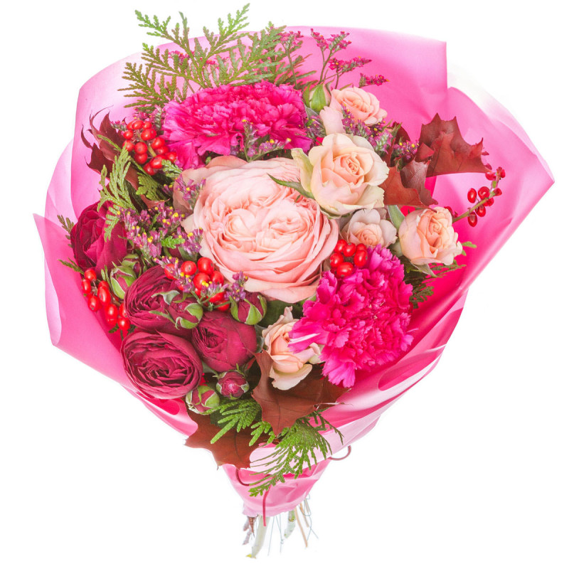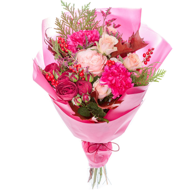 Эмоции нежности и яркости рождает этот букет с розовыми и бордовыми оттенками. В составе: роза кустовая, роза кустовая пионовидная, розовая хризантема, илекс и туя. Букет оформлен в розовую матовую пленку и перевязан розовой лентой. Эта композиция создаёт атмосферу утончённости и стиля. Подойдёт на встречу из роддома для сестры.