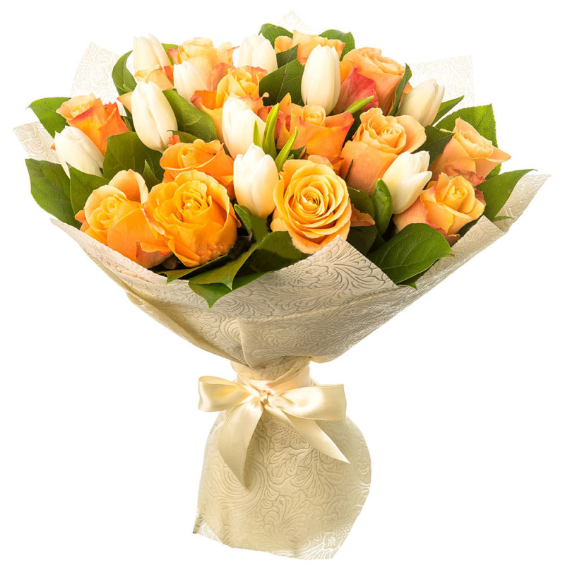 Букет из роз и тюльпанов «Персиковая нежность» можно купить в интернет-магазине - kupit-buketu.ru. Только свежие цветы. Более 50 стилей упаковок. Букеты создают более 100 флористов.