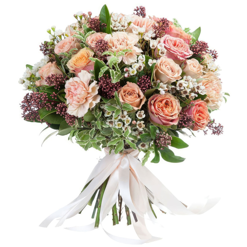 Теплая пастельная палитра розовых и кремовых оттенков создает нежное и романтичное настроение. Композиция состоит из роз, ваксфлауэра, скимии и озотамнуса, дополненных зеленью. Букет украшен светлой атласной лентой, придающей элегантность и утонченность. Эта композиция привнесет уют и гармонию в любой интерьер. Прекрасно подойдет для вручения молодой маме на выписку.