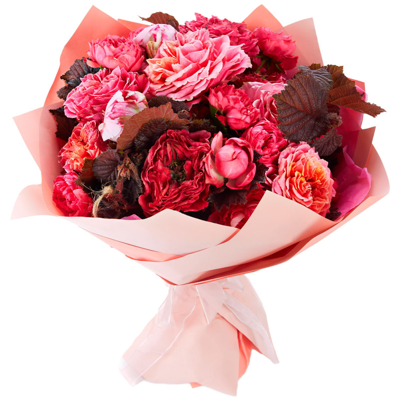 Яркие розово-красные оттенки пионовидных роз создают атмосферу нежности и романтики. В букете присутствуют одноголовые красные и розовые розы, дополненные зеленью. Упаковка выполнена из матовой плёнки, подчеркнутой аккуратной лентой. Этот букет создаёт атмосферу изысканности и утончённости. Подойдёт для поздравления молодожёнов на свадьбу.