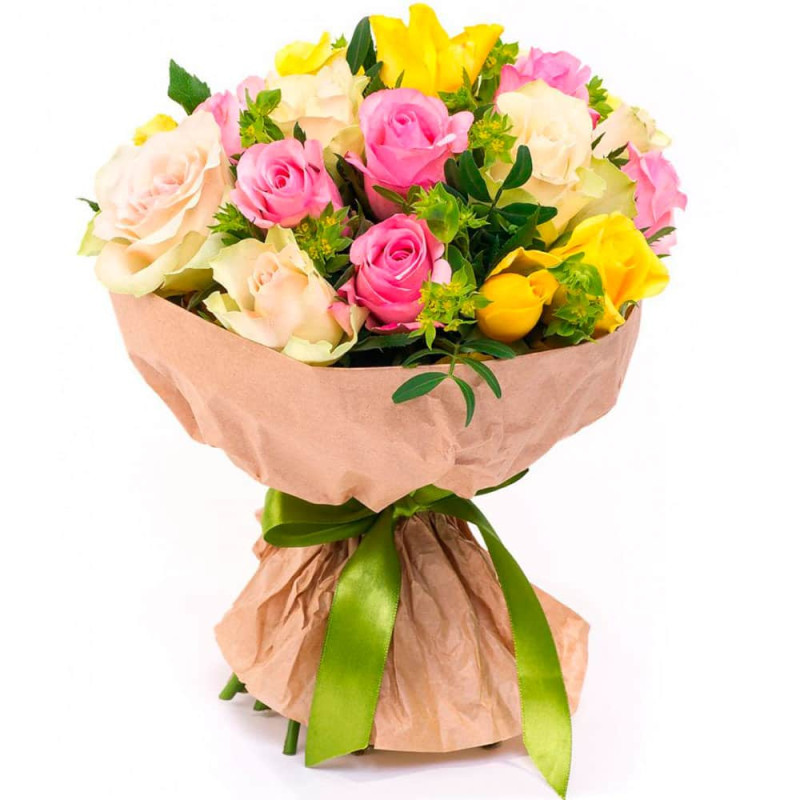 Яркие и нежные оттенки розового и желтого создают атмосферу радости и свежести. В составе букета розы одноголовые розовые, нежно-розовые и желтые, дополненные фисташкой. Упаковка выполнена из крафт-бумаги и украшена зелёной лентой. Композиция создаёт атмосферу праздника и радости. Прекрасный подарок для любимого человека на день рождения или юбилей.