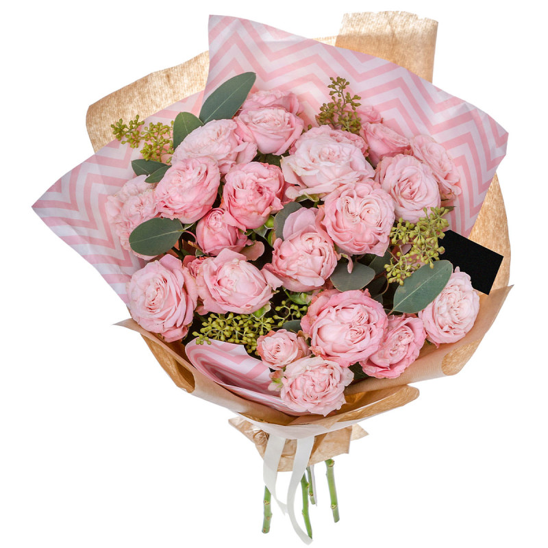 Нежные розовые оттенки кустовых роз создают атмосферу легкости и романтики. Букет включает розовые кустовые розы, эвкалипт и зелень. Упакован в стильную крафт-бумагу с зигзагами и матовую пленку, дополнен белой лентой. Эта композиция идеально подойдет для романтического вечера для вашей любимой.