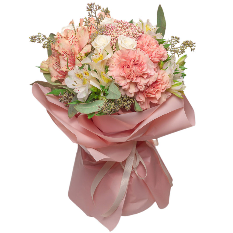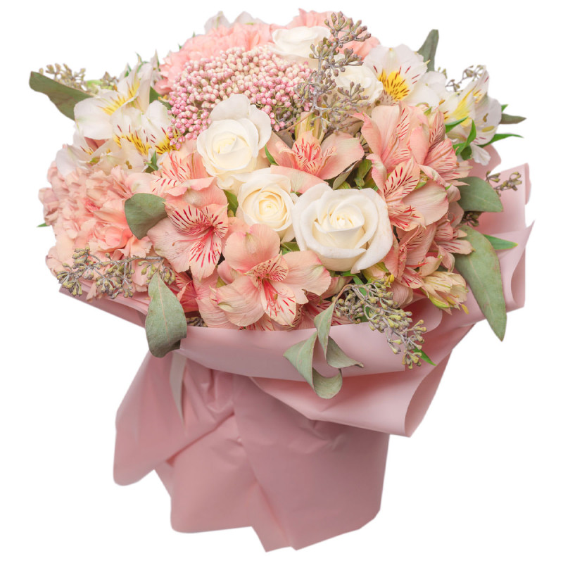 Нежные розовые и белые оттенки создают атмосферу утонченной элегантности. В составе букета: белая и розовая альстромерия, розовая пионовидная гвоздика, озотамнус, белая роза и эвкалипт. Букет оформлен в розовую матовую пленку, перевязанную изящной лентой. Этот букет дарит ощущение радости и подходит для поздравления на рубиновую свадьбу, особенно для подруги.
