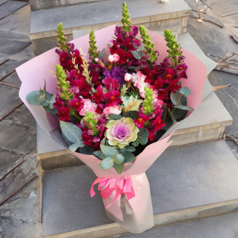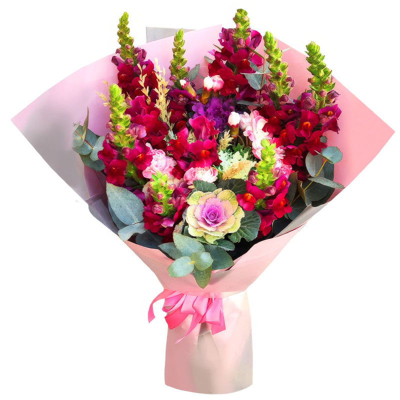 Погрузитесь в атмосферу ярких эмоций с этим красочным букетом. В его составе львиный зев красного цвета, изысканная брассика и нежный эвкалипт. Букет оформлен в розовую матовую пленку и завязан атласной лентой в тон. Эта композиция создаёт атмосферу радости и тепла. Подходит для поздравления подруги на день рождения.