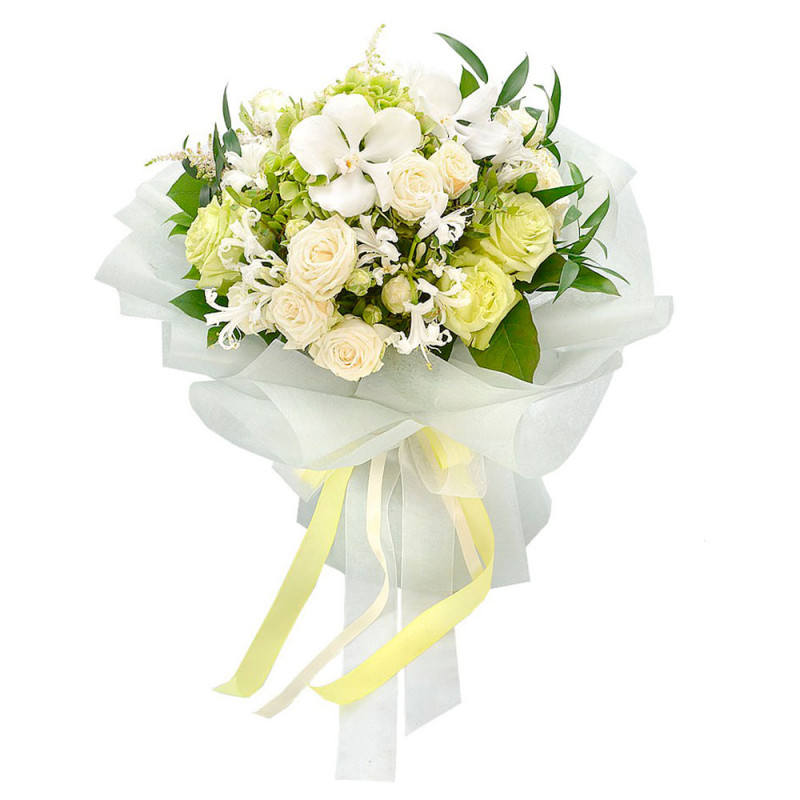 Элегантное сочетание белых и зелёных оттенков создаёт атмосферу свежести и нежности. В букете собраны гортензия зелёная, белая орхидея, нерина, светло-салатовая одноголовая роза, белая кустовая роза, салал, астильба, рускус итальянский и фисташка. Композиция оформлена в матовую плёнку и перевязана атласной лентой нежного оттенка. Букет создаёт атмосферу романтики и подходит для поздравления молодожёнов на свадьбу.