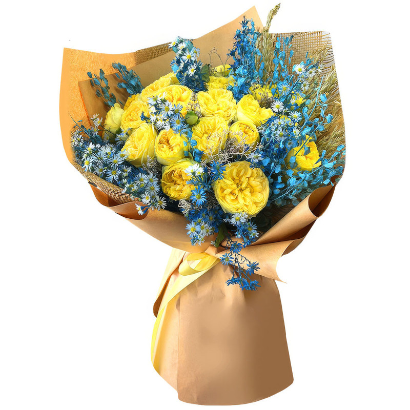 Яркая гамма желтых пионовидных роз и голубых ромашек с лунарией создаёт радостное настроение. В составе букета: роза одноголовая пионовидная желтая, ромашка голубая, лунария голубая. Упакован в крафт-бумагу и матовую плёнку с изящной сатиновой лентой. Эта композиция принесёт атмосферу счастья и тепла. Идеально для подарка маме на День матери.