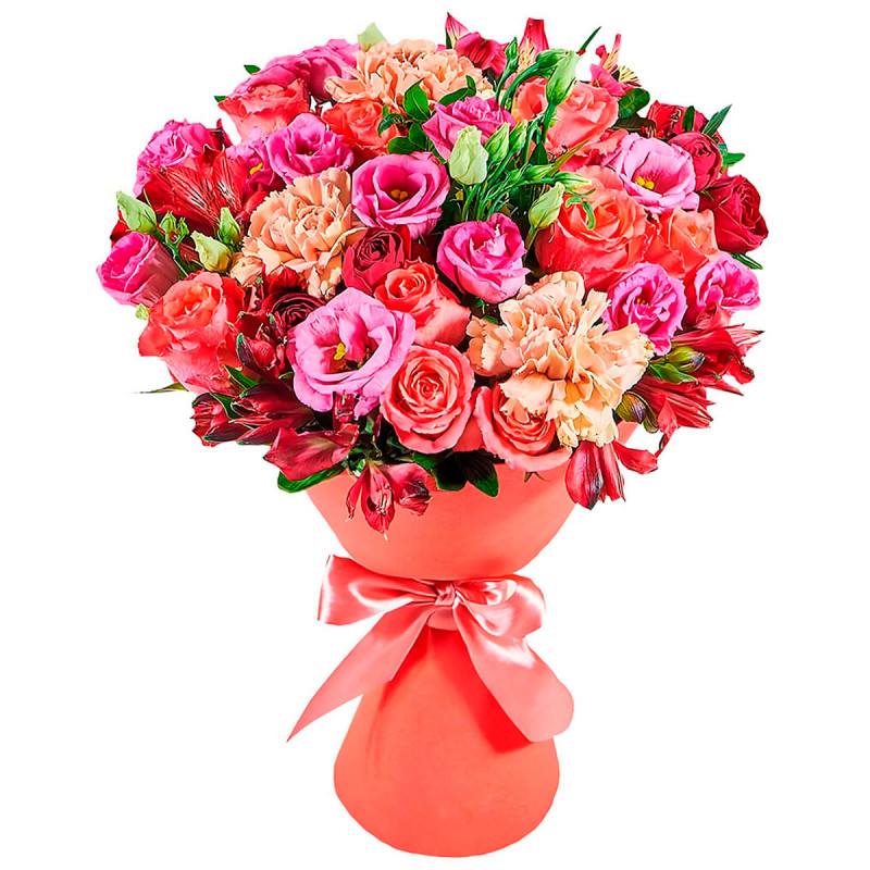Яркие коралловые и розовые оттенки розы, альстромерии, эустомы и персиковой гвоздики создают атмосферу радости и легкости. Букет оформлен в красочную матовую пленку с нежной атласной лентой. Эта композиция наполняет пространство теплом и подходит для поздравления начальницы на День учителя.