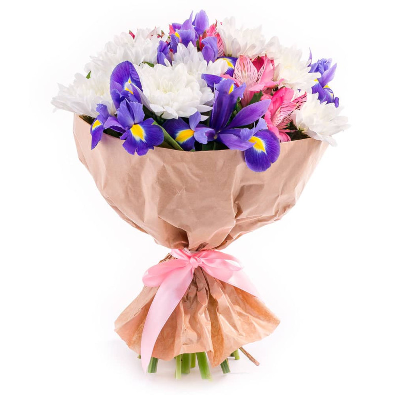 Яркие и нежные оттенки белоснежных хризантем, фиолетовых ирисов и розовых альстромерий создают атмосферу радости и свежести. Букет оформлен в крафт-бумагу с розовой атласной лентой. Композиция наполняет пространство лёгкостью и элегантностью. Прекрасный подарок для поздравления с днём рождения или выражения благодарности близкому человеку.