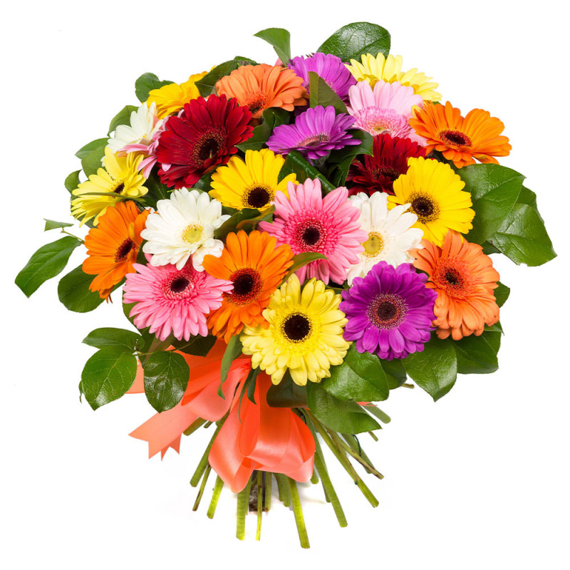 Яркие и сочные оттенки гербер — белая, желтая, оранжевая, розовая, красная и фиолетовая — создают атмосферу радости и тепла. Каждый цветок в букете обрамлен нежной зеленью, что придает композиции свежесть. Упаковка выполнена в оранжевой матовой пленке и дополнена атласной лентой, завязанной в аккуратный бант. Этот букет станет отличным подарком для руководителя на юбилей и создаст праздничное настроение.